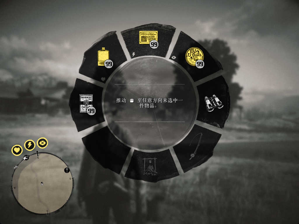 收集了接近所有可快捷(按TAB出来的物品栏)使用的物品,例如:私酒、人参灵药、陈年海盗朗姆酒,缬草根等,数量均为99个,除个别有上限限制;目前只缺面包块(数量为3,找不到别的了)以及开过的马匹兴奋剂。(数量为0,全图搜遍了也搜不出来了。或许大后期这类道具绝版了)